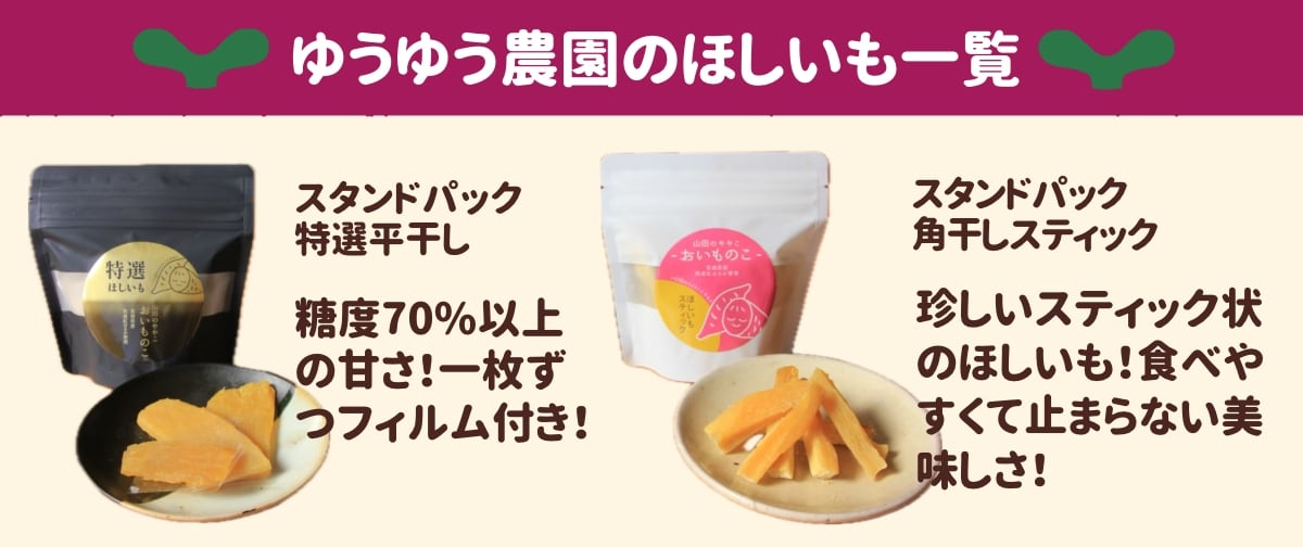 「【新商品】山田のややこ -おいものこ- スタンドパックセット 380g」は、茨城県産自社栽培の紅はるかを使用したほしいもの新商品詰め合わせセットです。 ・【新】自立型特選平干し(スタンドパック:個包装)60g×1個 ・特選平干し100g(糖度70%以上を選び抜きました!) ・【新】自立型角干しスティック(スタンドパック)100g×1個 ・角干しスティック120g(色が違う部分でホクホク・ネットリ食感が違って楽しいベタつかない!) 農園のこだわりは、無添加・無着色。自然の甘さを最大限に引き出し、素材本来の美味しさを味わえます。ねっとりとした食感と、口の中で広がる「熟成紅はるか」本来の風味は、やみつきになること間違いなしです。 ゆうゆう農園では、自社での栽培にこだわり大切に育て上げた紅はるかを使用しています。 収穫後は一つひとつ手作業で丁寧に洗浄し、毛羽立ちのないキレイなほしいもに仕上げています。 手作業での収穫・加工のため、一つ一つの形状や大きさが異なる場合がありますが、その個性こそが、自然の証です。ゆうゆう農園ならではの「手作り感」をお楽しみください。 今日からあなたの家族の一員としてお世話になります。 山田のややこーおいものこーをよろしくお願いいたします。 ※賞味期限は常温、冷蔵、冷凍によって異なりますので、ご希望がありましたらご連絡ください。