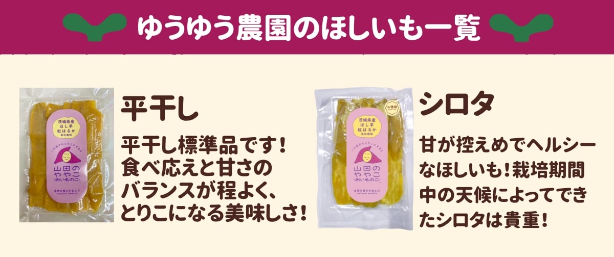 「山田のややこ -おいものこ- ほしいもセット 小」は、茨城県産自社栽培の紅はるかを使用したほしいもです。 糖度70%の甘さが特徴で、さつまいも本来の風味をしっかり堪能することができます。 農園のこだわりは、無添加・無着色。自然の甘さを最大限に引き出し、素材本来の美味しさを味わえます。ねっとりとした食感と、口の中で広がる「熟成紅はるか」本来の風味は、やみつきになること間違いなしです。 ゆうゆう農園では、自社での栽培にこだわり大切に育て上げた紅はるかを使用しています。 収穫後は一つひとつ手作業で丁寧に洗浄し、毛羽立ちのないキレイなほしいもに仕上げています。 手作業での収穫・加工のため、一つ一つの形状や大きさが異なる場合がありますが、その個性こそが、自然の証です。ゆうゆう農園ならではの「手作り感」をお楽しみください。 今日からあなたの家族の一員としてお世話になります。 山田のややこーおいものこーをよろしくお願いいたします。 ※賞味期限は常温、冷蔵、冷凍によって異なりますので、ご希望がありましたらご連絡ください。