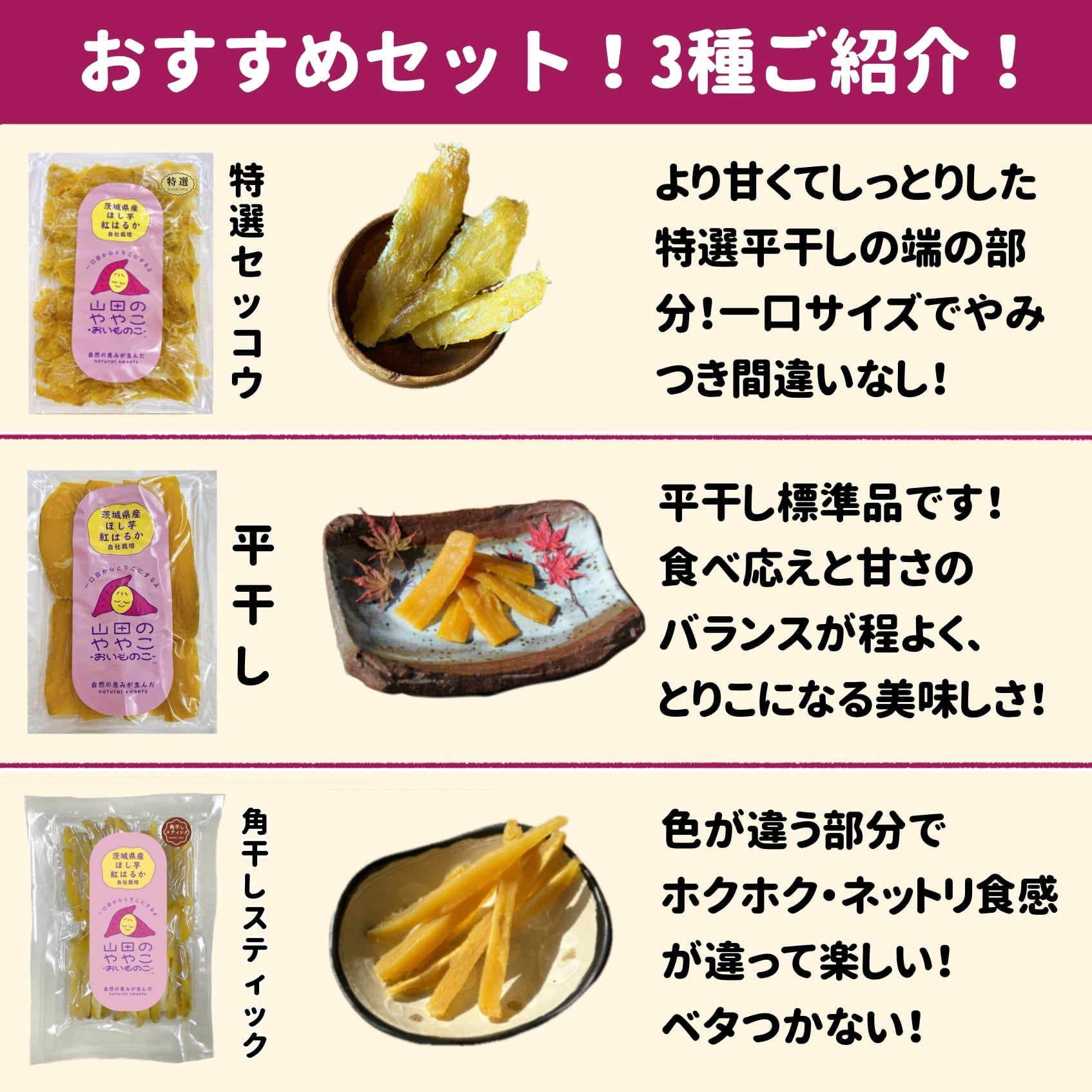 「山田のややこ -おいものこ- おすすめセット600g」は、茨城県産自社栽培の紅はるかを使用したほしいものお得詰め合わせセットです。
